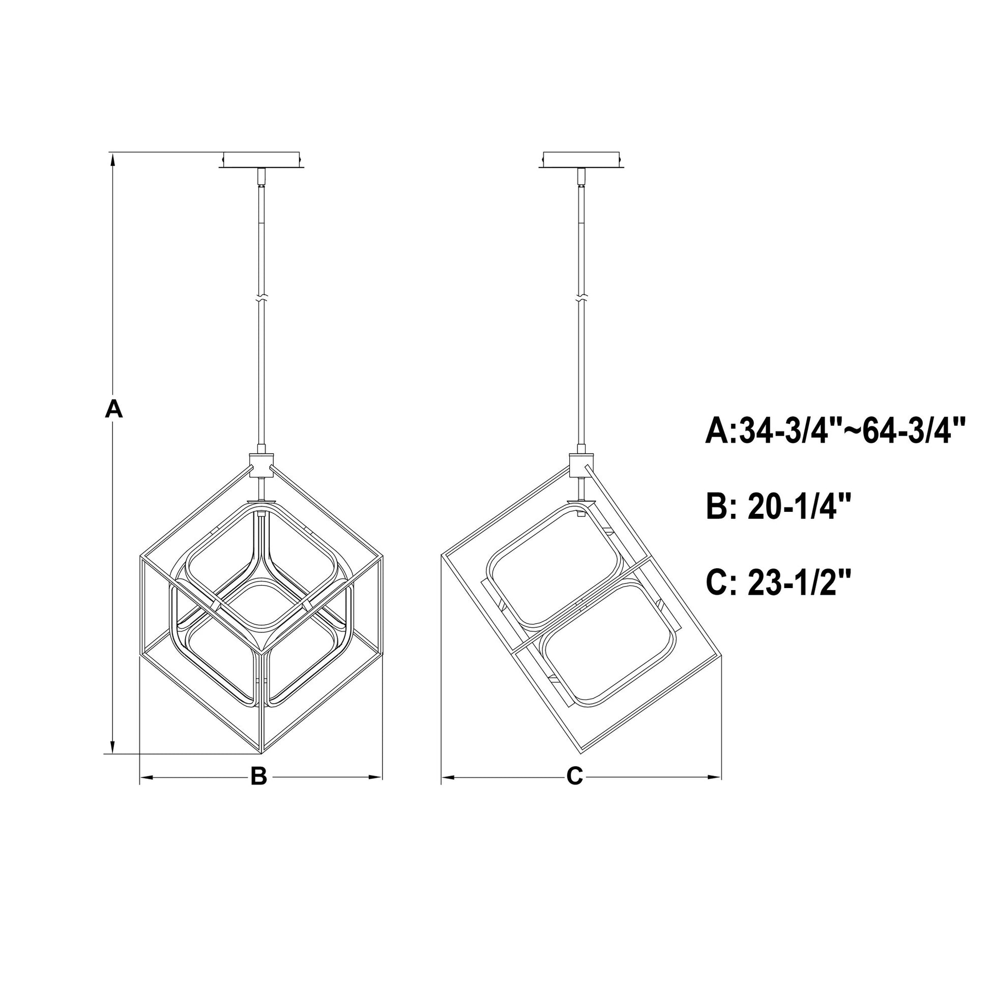 • Mounting & Dimensions: Hardwired with rod hanging method; canopy 6.3" W × 1.26" H × 6.3" D; overall adjustable height 34.75"–64.75"